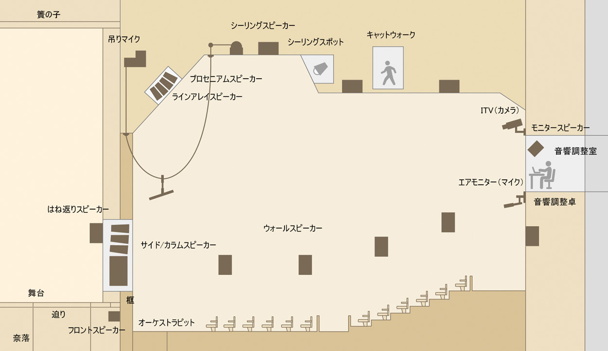 エアモニター:<同義語、略語>エアモニ 音響調整卓(おんきょうちょうせいたく)【(英) mixing desk/mixing board/mixing Console】:<同義語、略語>卓、ミキサー 框(かまち) キャットウォーク【(英) cat walk】 簀の子(すのこ)【(英)grid/gridiron】 奈落(ならく)【(英) trap cellar】 ラインアレイ【(英) Line array】 モニタースピーカー【(英) monitor loudspeaker】:<同義語、略語>コントロールルームモニター ITV 【(英) industrial television】 はね返りスピーカー(はねかえりスピーカー)【(英) foldback /stage monitor speaker】:<同義語、略語>はね返り、FB 音響調整室(おんきょうちょうせいしつ) 吊りマイク(つりマイク) フロントスピーカー:<同義語、略語>ステージフロントスピーカー、ステフロ シーリングスポット シーリングスピーカー 迫り(せり)【(英) riser /scenery elevator】 舞台(ぶたい)【(英)stage】 ウォールスピーカー オーケストラピット【(英) orchestra pit】:<同義語、略語>オケピ サイド/カラムスピーカー【(英) column loudspeaker】 プロセニアムスピーカー【(英) proscenium loudspeaker】