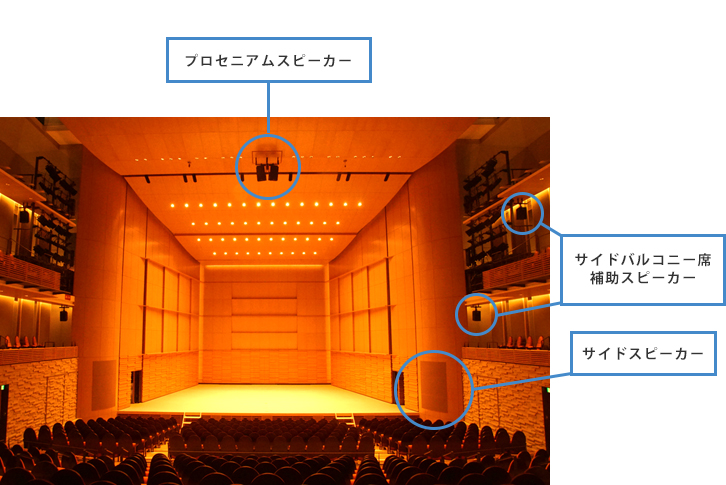 声楽の生の声が良く響くように設計されたホールですので、PAで音を増幅すると、音が響きすぎて聞こえづらい点があります。当ホールはプロセニアムスピーカーにNEXO「PS15U」、サイドスピーカーに「PS15U」+「LS18」が採用され、シンプルなスピーカーシステムがゆえ響きすぎることなく、パワフルですので十分な音量でクリアな拡声ができます。さらにサイドバルコニー席にはヤマハの「CBR10」を、またアンダーバルコニースピーカーには「VXC5FW」を使っています。