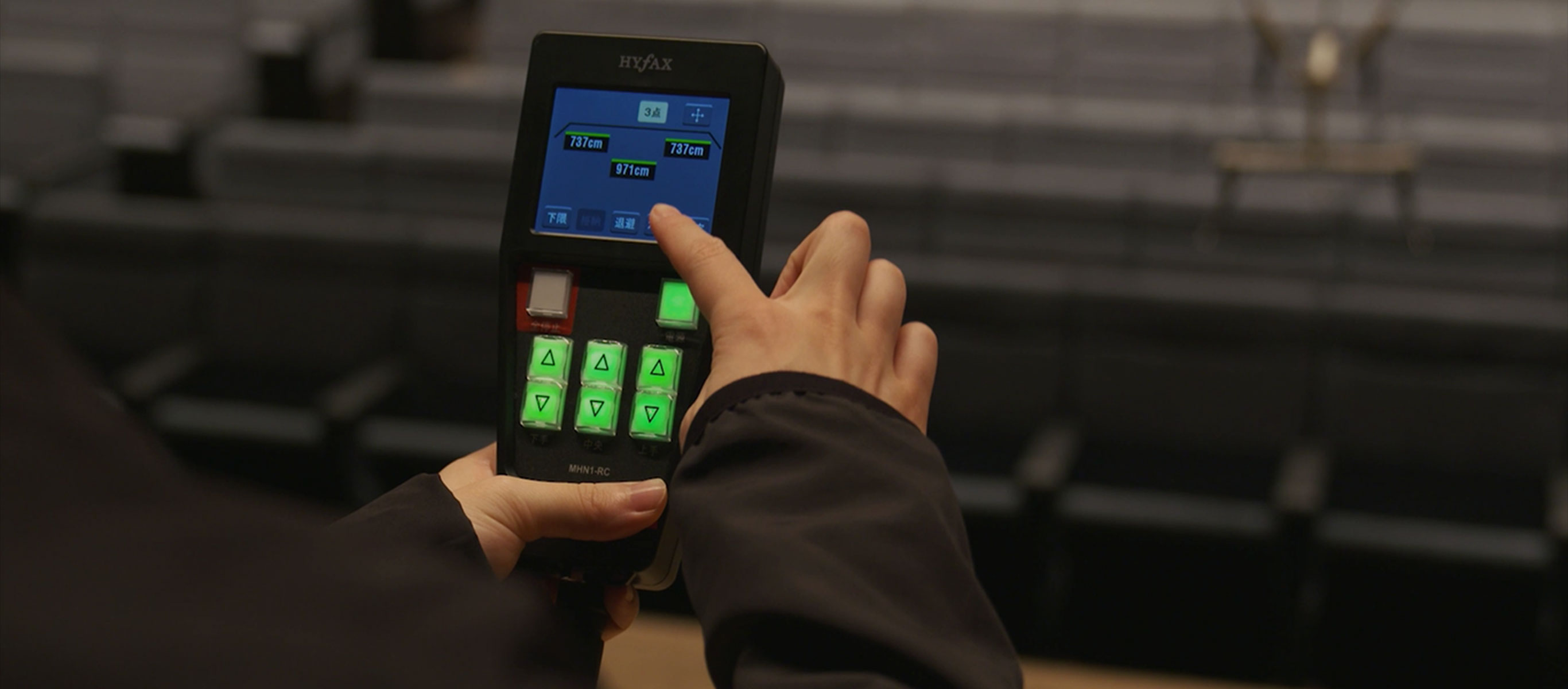 リモート操作機には直感的な操作ができる「マニュアルスイッチ」とケーブルの長さを指定し詳細な位置指定ができる「タッチパネル画面」を搭載。設定したパラメーターは記憶できるので、簡単にマイクの位置を再現できます。リモート操作器は客席・舞台袖・調整室などから使えるように、最大8台同時接続が可能です。