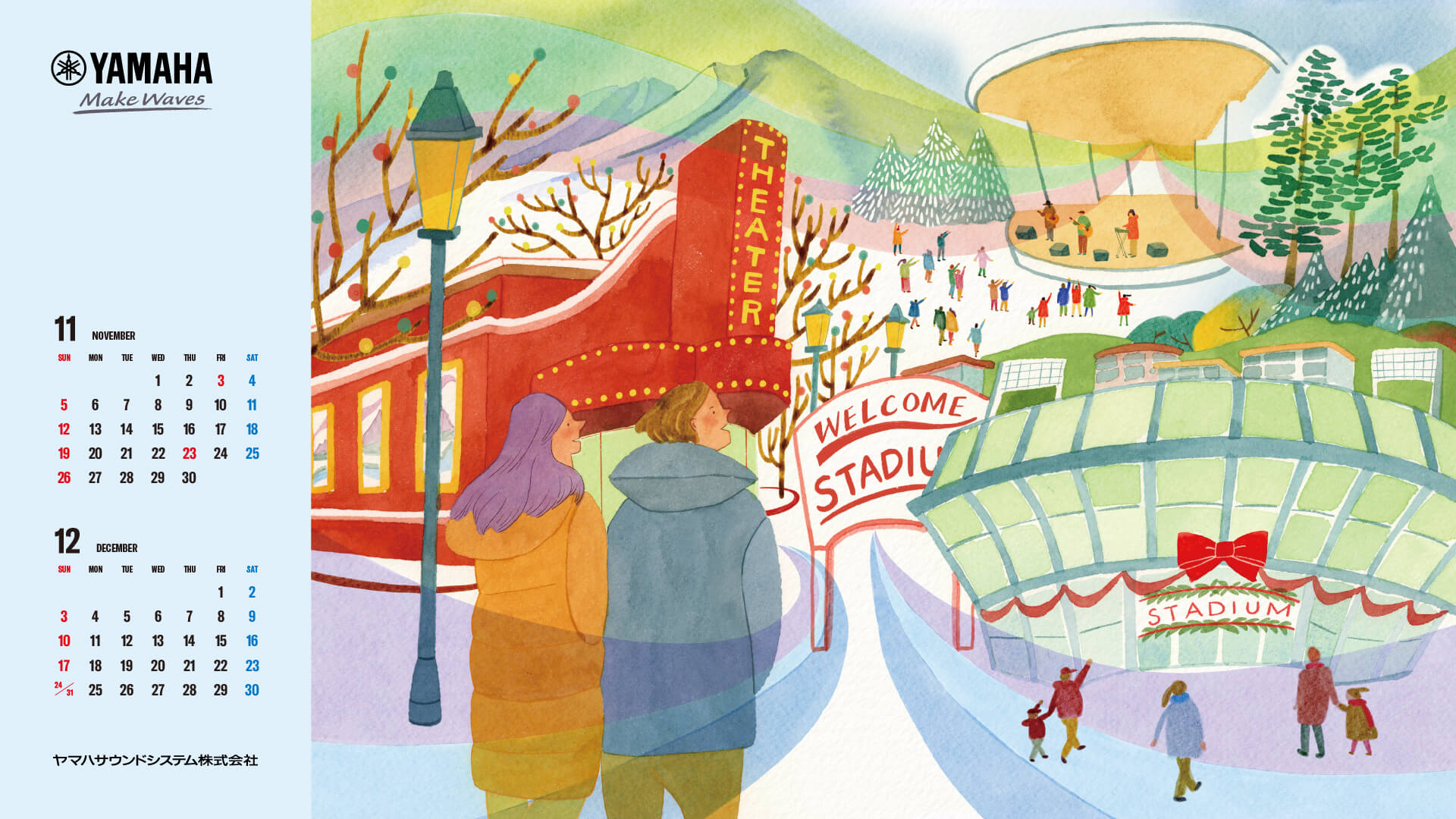 施設から活気があふれ、街全体へ楽しさが広がる。文化に触れる人々が増え、豊かな世界へと活気づいていく。そんな想いをカレンダーに込めて作りました。